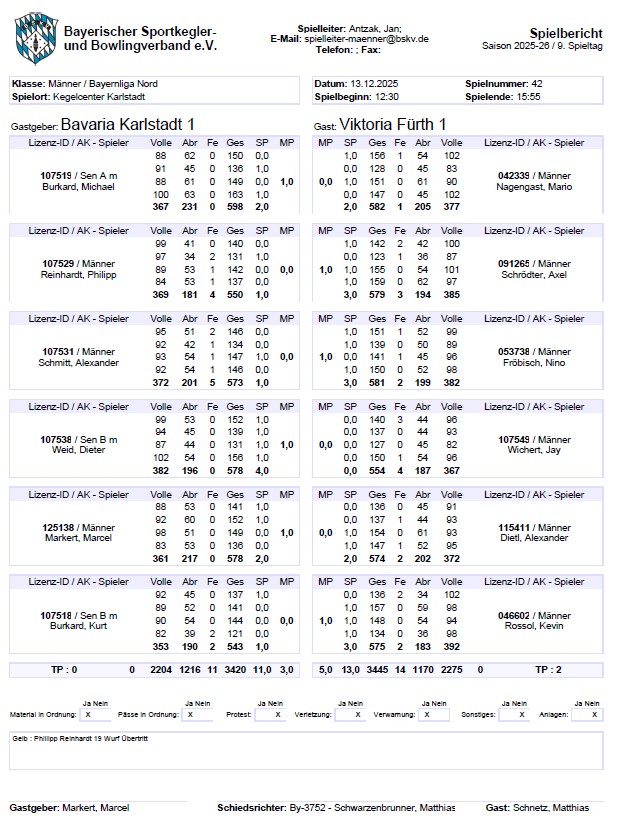 Termin Details Datum: 13. Dezember 2025 12:30 – 16:30 Ort: Kegelzentrum Karlstadt Terminkategorien: Spielplan Viktoria 1 - Saison 2025/26
