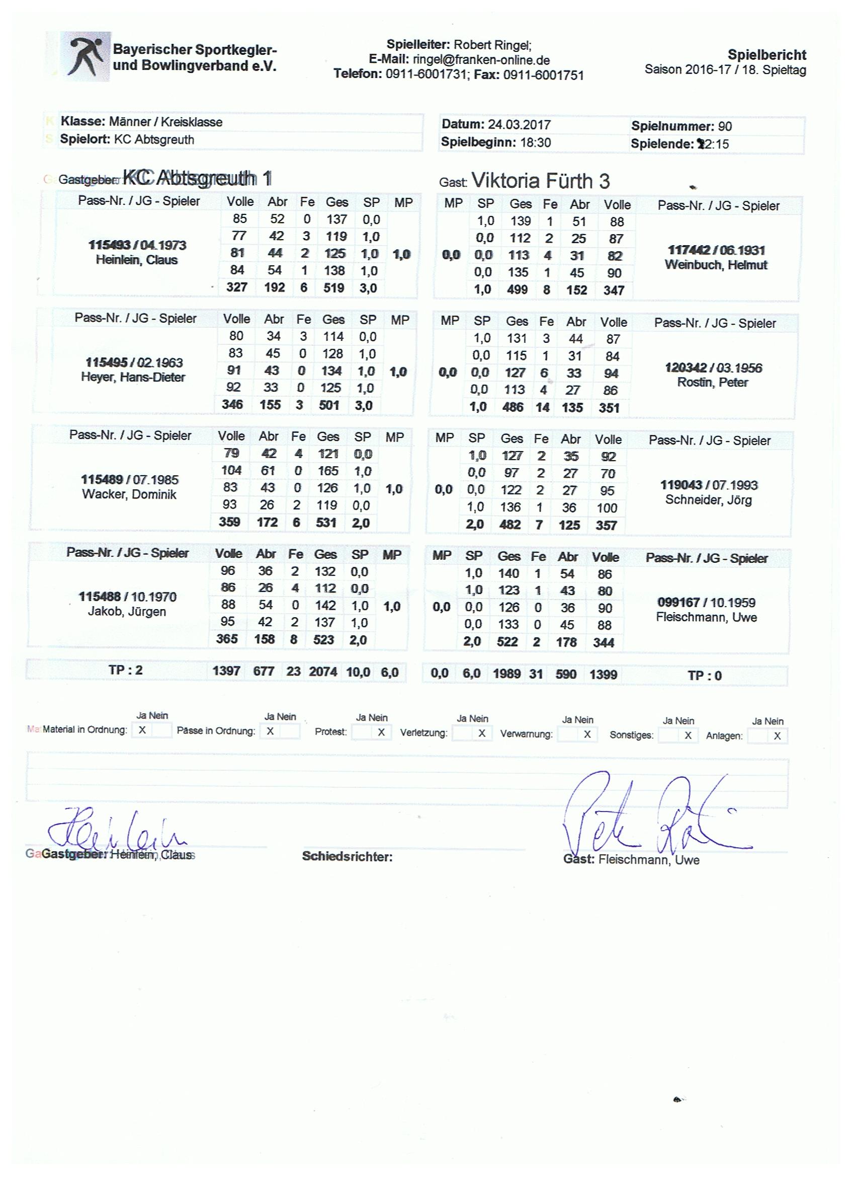 Termin Details Datum: 24. März 2017 18:30 – 22:30 Ort: Kegelclub Abtsgreuth Terminkategorien: Spielplan Viktoria 3 - Saison 2016/17